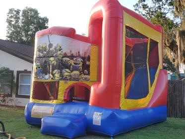The Backyard combo style bounce house is the ultimate in inflatable jumpers! The large interior jumping area offers a basketball hoop. This bouncy castle has a climb feature and a convenient exit slide for hours of active fun! Parents and spectators are offered a clear view with the 360-degree mesh sides of this moonwalk. The Backyard combo bounce house is made of lite n strong™ fire-resistant vinyl for safety, durability and easy portability. This Backyard bouncy house is sure to make any indoor or outdoor event a great success!