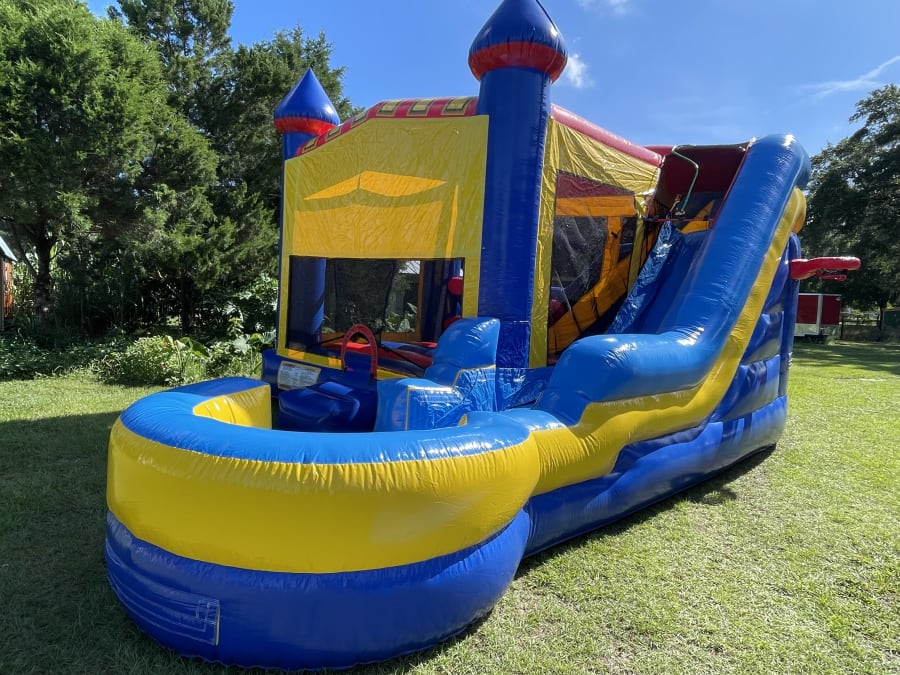 The Module 7-1 wet or dry combo style bounce house is the ultimate in inflatable jumpers! The large interior jumping area offers a basketball hoop and obstacles. This bouncy castle has a climb feature and a convenient exit slide for hours of active fun! Parents and spectators are offered a clear view with the 360-degree mesh sides of this moonwalk. The 7-1 wet or dry combo bounce house is made of lite and strong™ fire-resistant vinyl for safety, durability, and easy portability. This Module 7-1 wet or dry combo bouncy house is sure to make any indoor or outdoor event a great success!